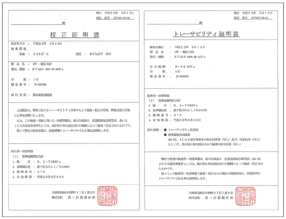 気密テスト・耐圧テスト圧力を正確な精度で把握できます。校正証明書、トレーサビリティ証明書は別途有償にて用意いたします。