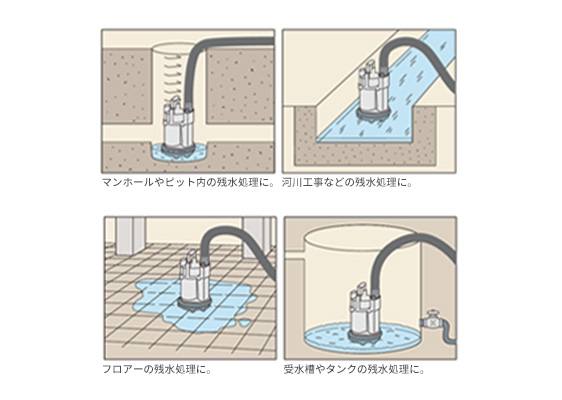 受水槽やタンク、マンホールや河川工事などの幅広い現場での残水処理に活躍