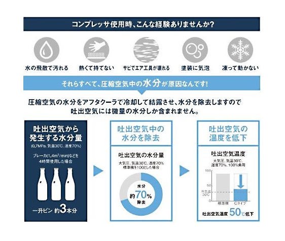 圧縮空気中の水分をアフタクーラで冷却して結露させ水分を除去します。