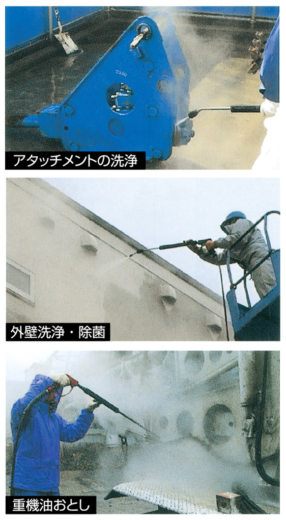 強力なディーゼルエンジンによる高圧力と温水・スチームの洗浄効果で、汚れをしっかり除去します。仕様により稼働中の騒音を抑え、作業環境を快適に過ごします。