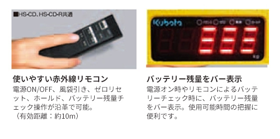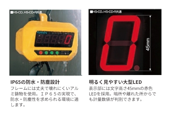フレームには丈夫で壊れにくいアルミ鋳物を使用。IP65の実現で、防水・防塵性を求められる環境に適します。表示部には文字高さ45mmの赤色LEDを採用。暗所や離れた所からでも計量数値が判別できます。赤外線リモコンで電源ON/OFF、風袋引き、ゼロリセット、ホールド、バッテリー残量チェック操作が沿革で可能(有効距離:約10m)。電源オン時やリモコンによるバッテリーチェック時に、バッテリー残量をバー表示。使用可能時間の把握に便利です。