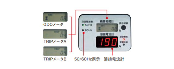 設定電流/実電流やエラーコードを昼・夜間で確認しやすい高輝度デジタル表示の電流計と、積算時間/メンテナンス時間を表示するトリップメータ機能、キー OFF時にも表示する積算時間計が一体になったデジタルモニタの採用で、作業効率がアップします。
