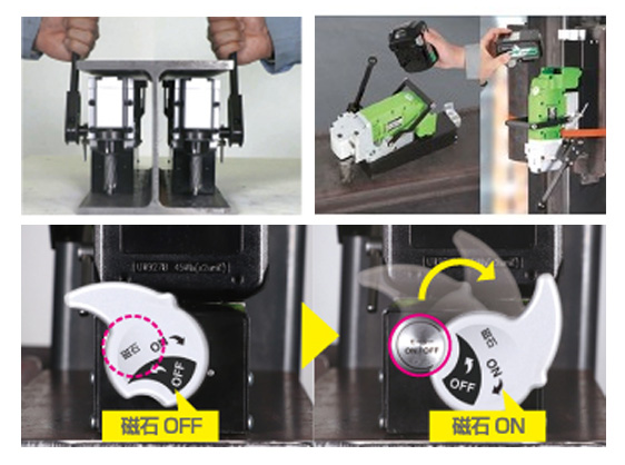 穴あけ作業中にバッテリーが切れても磁力が働いているため、穴位置を決めたまま安全にバッテリー交換を行えて、作業をすぐに再開できます。また、縦使いや逆さ使い時の落下リスクを低減します。