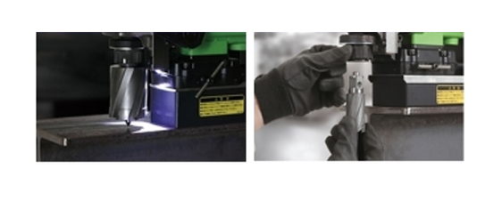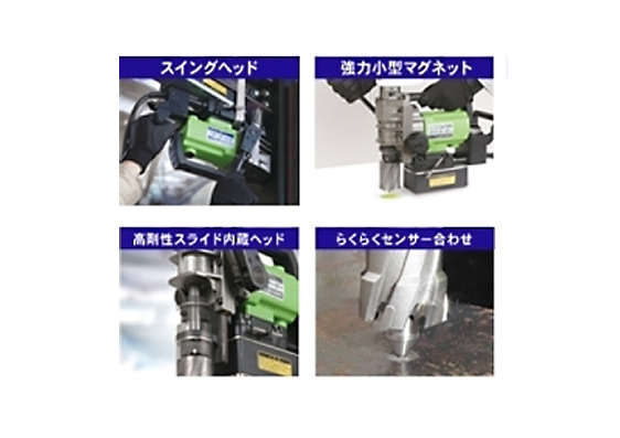 スイングヘッド機能により障害物を避け、穴位置調整が可能です。100mm鋼のウェブ面も加工が可能です。強力小型マグネット採用で縦使いもしっかり固定できます。