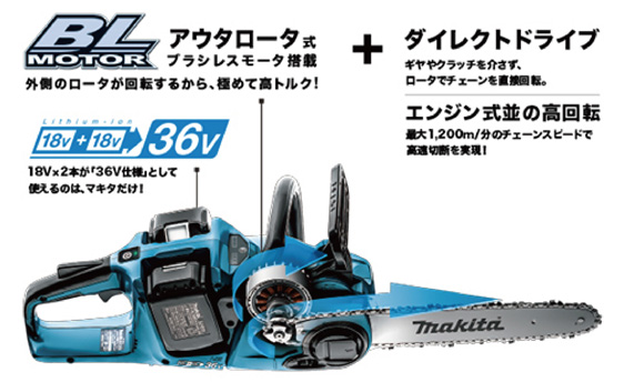 18Vバッテリー2本で36V仕様となり、ダイレクトドライブ方式でギアやクラッチを使わずにチェーンを直接回転させます。
