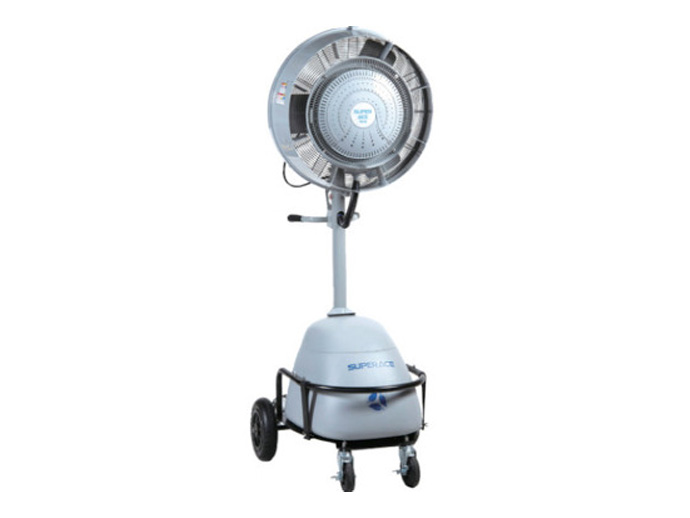 工事現場の熱中症対策に最適。 独自の大型遠心プレートで細かいミストを発生させます。 整流板付きの大型ファンにより、最大11mまで噴霧可能で、ノズルがないため目詰まりの心配がありません。