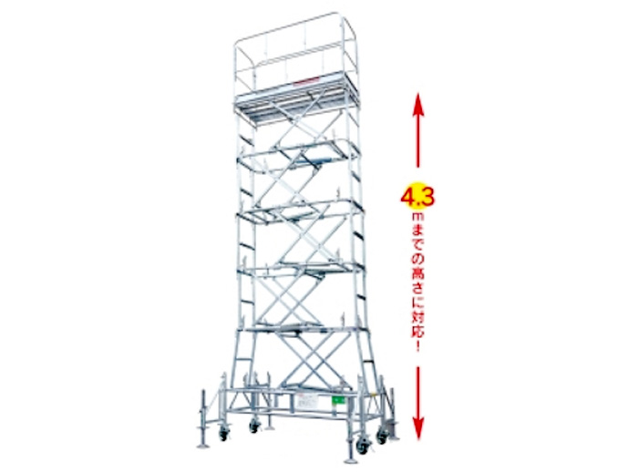 配管配線工事、内装工事、塗装工事、溶接工事にはもちろん、工場・空港・造船場における補修・点検、倉庫における商品の棚卸しにも役立ちます。 ●安全です アウトトリガーを設置することで、横荷重による6度の転倒余裕角度が保たれますので、高所での作業も安全に行えます。 ●現場に必要な作業高さを選べます 6段階の高さ調節(1.50m~4.30m)ができますので、様々な作業環境に対応できます。 ●耐久性 ●移動・収納・保管がらくにできます