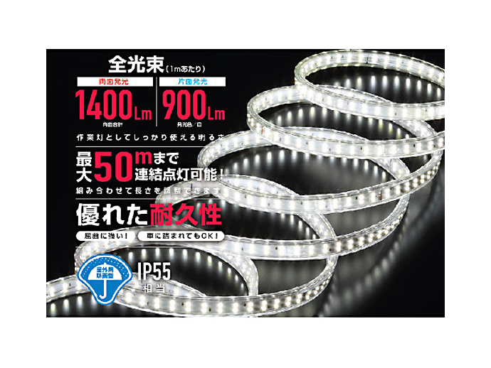 屋外用 二重絶縁 使用場所に合わせてフレキシブルに曲げられるLED照明 全光束(1mあたり)両面発光(1400Lm) 片面発光(900Lm) 最大50mまで連続点灯可能! 優れた耐久性 屈曲に強い 車に踏まれてもOK! 屋外用 防雨型IP55相当