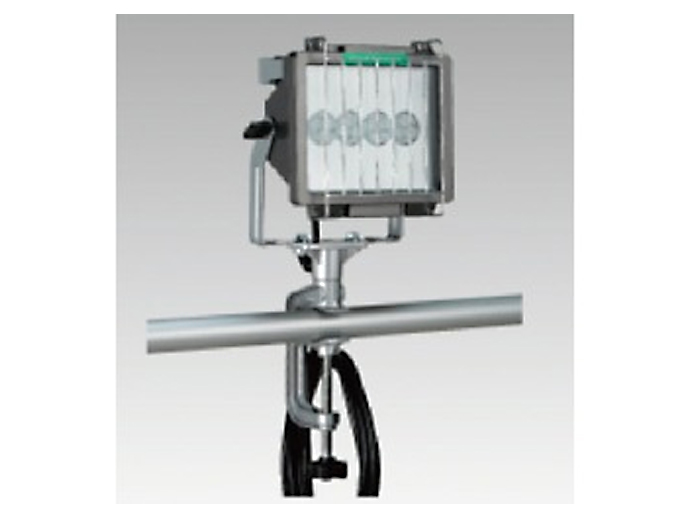作業現場用に適した広範囲照明。 雨中でも安心の屋外用防雨型です。 本体は丈夫で軽量コンパクトのアルミダイカストボディ。 バイスでしっかり固定できます(有効締付幅98mm)。 明るさは約2,400lm(ルーメン)