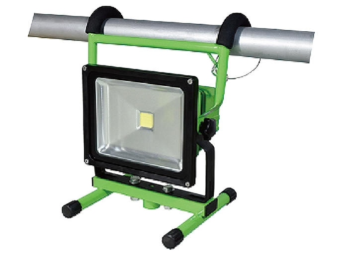 30Wの充電式LEDライト。持ち手部分がハンガーなのでパイプにかけて使えます。 床スタンドはそのまま三脚にも取付けが可能。 明るさは2階切替。充電4時間で点灯時間は約3時間~14時間。