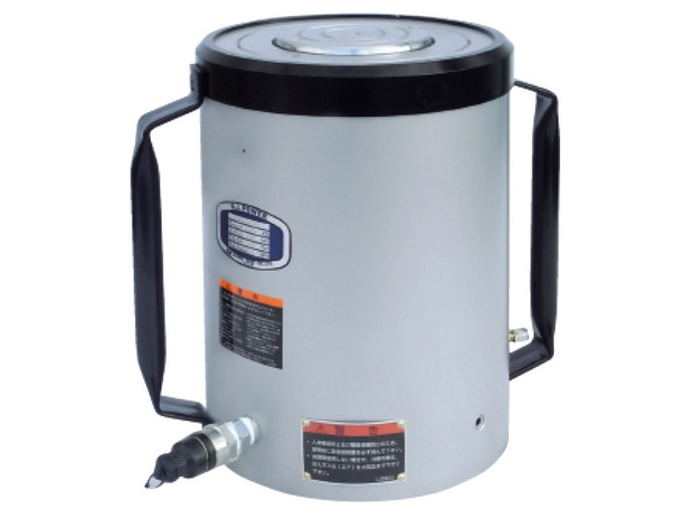 軽量でコンパクトな設計が特徴。耐圧試験は揚力100%、横荷重は揚力の1/20です。ピストン摺動部は銅合金、ピストンロッドは硬質クロムメッキ処理が施され、シリンダとピストンはSCM435で熱処理した強力材です。カップラのネジ径はNPT3/8です。