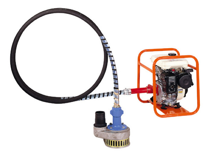 ハイギャップ構造のハイスピン形羽根車の採用で、さらに摩耗に強くなり、砂などのロックが少ないハイグレードなポンプです。 耐摩耗・耐久性・軽量性をより重視し、アルミダイカスト部分を特殊合成ゴムで被覆した仕様としました。ポンプ下部はボックスレンチ1本で簡単に分解でき、メンテナンスが容易になりました。 一般工事排水用(水中ハイスピンポンプ)