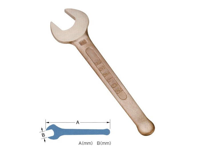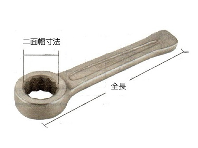 メガネレンチに打撃を与えながらボルト・ナットの締め付け、取り外しが可能です。 ■防爆性 打撃や厳しい摩擦によっても爆発源となる火花が出ないため、石油化学工場、製油所、船舶、航空整備工場など火花を嫌う場所で使用します。 ■非磁性 非磁性のため磁気を嫌う作業員に最適です。 ■耐蝕性 耐蝕性にもすぐれ長期間使用してもさびません。 ■高強度 銅製工具とほぼ同等の強度をもっているので工具として支障なくご使用いただけます。